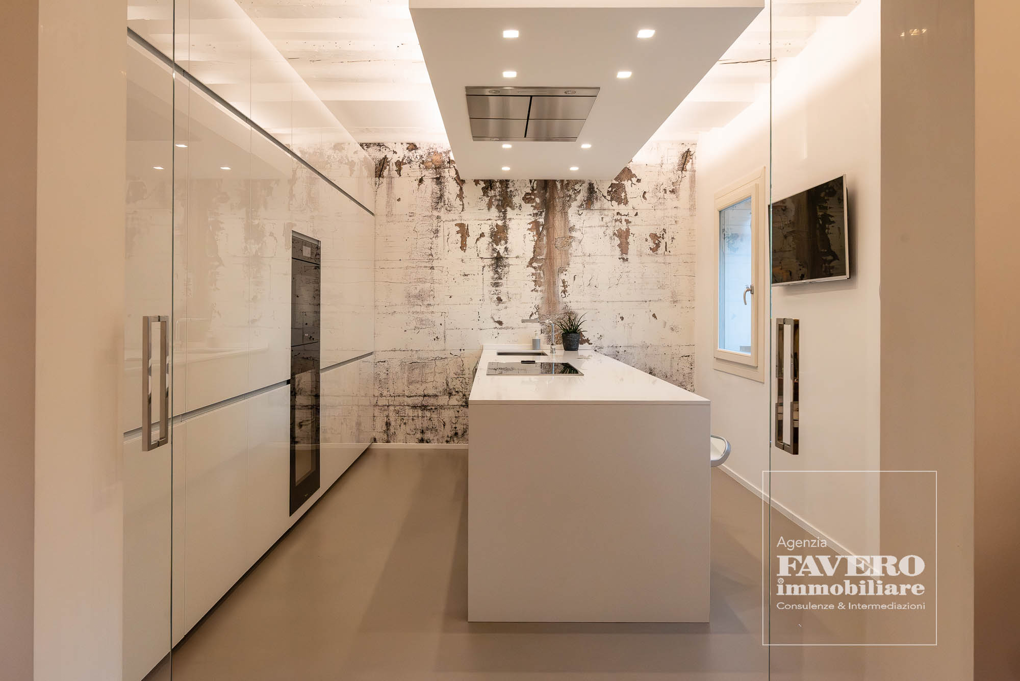 All’interno, il soggiorno è il vero protagonista: una vetrata a tutta altezza, elemento unico, inonda l’ambiente di luce naturale e crea un collegamento diretto con l’esterno, amplificando la percezione degli spazi.